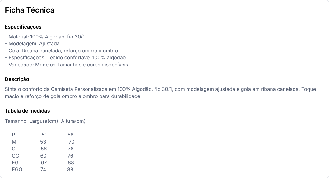 - Material: 100% Algodão, fio 30/1 - Modelagem: Ajustada - Gola: Ribana canelada, reforço ombro a ombro - Especificações: Tecido confortável 100% algodão - Variedade: Modelos, tamanhos e cores disponíveis.