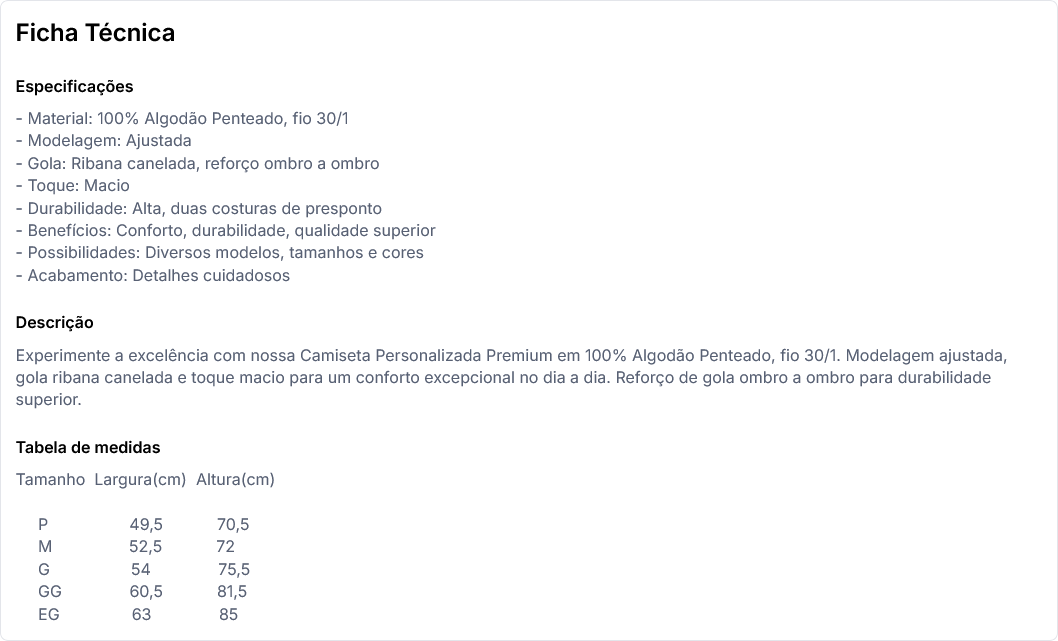 - Material: 100% Algodão Penteado, fio 30/1 - Modelagem: Ajustada - Gola: Ribana canelada, reforço ombro a ombro - Toque: Macio - Durabilidade: Alta, duas costuras de presponto - Benefícios: Conforto, durabilidade, qualidade superior - Possibilidades: Diversos modelos, tamanhos e cores - Acabamento: Detalhes cuidadosos